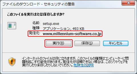 次のセキュリティの警告ダイアログが出た場合、発信元が「www.millennium-software.co.jp」であることを確認して、「実行」をクリックしてください。
